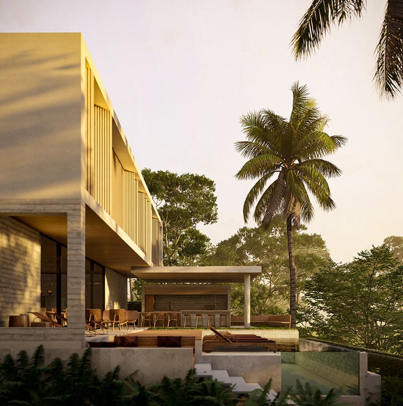 Ter o pôr do sol refletindo a piscina e quartos da casa, é o maior sonho e desejo deste nosso casal de clientes. Foi então que elevamos o nível principal da casa para que a piscina acontecesse bem mais acima do nível mais baixo do terreno, existia um declive.